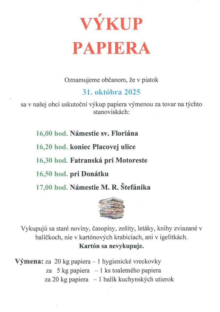 Vážení spoluobčania, dňa 31. októbra (piatok) 2025 sa v našej obci uskutoční výkup papiera.