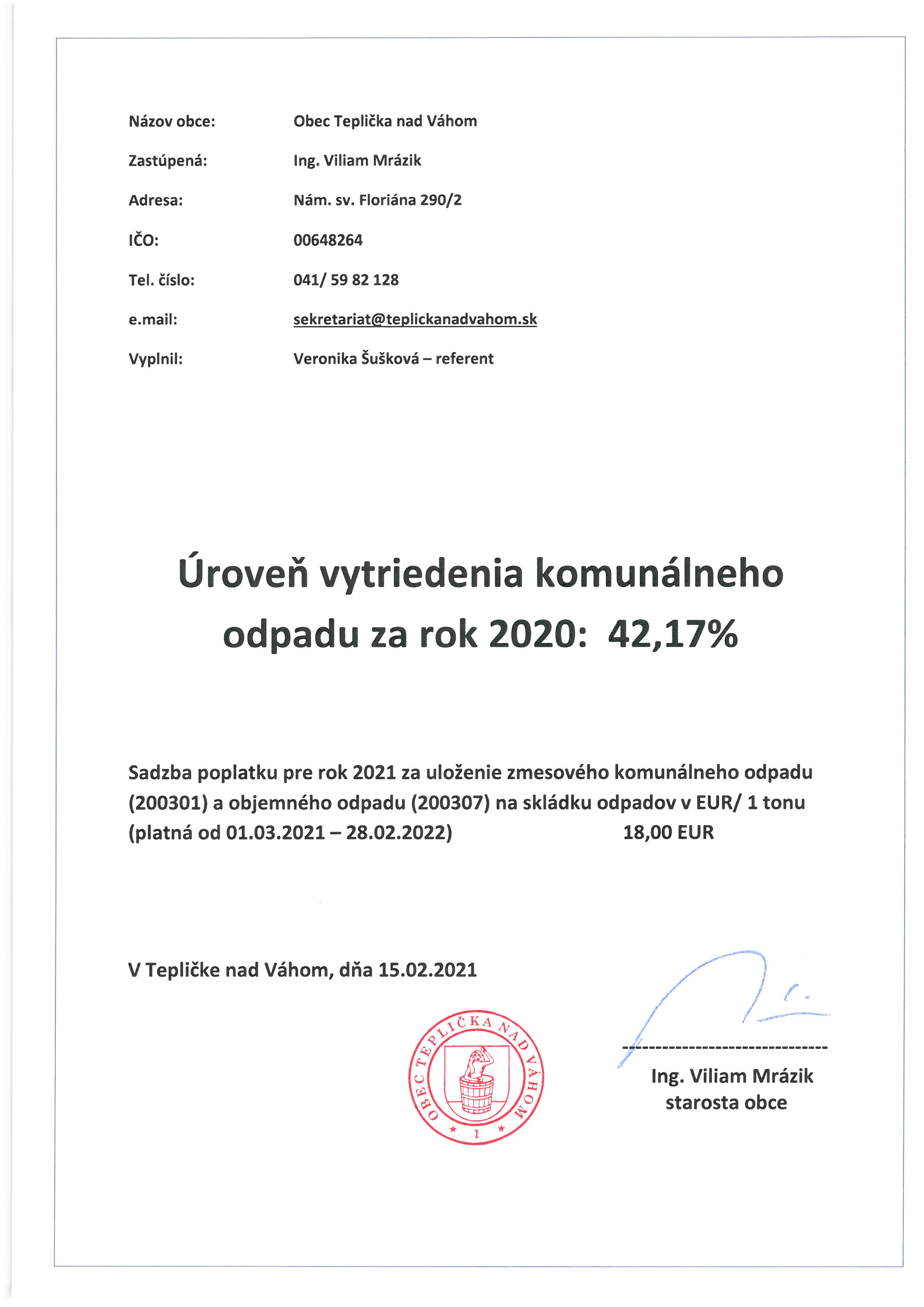 Ročný výkaz o komunálnom odpade z obce za rok 2020