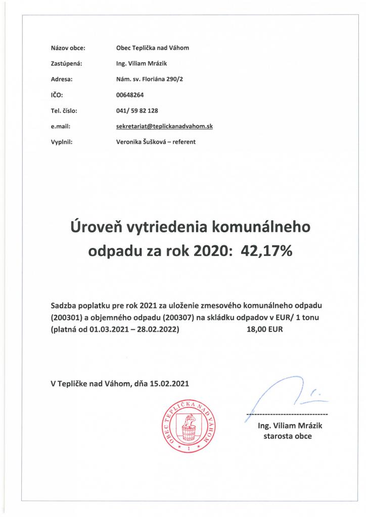 Úroveň vytriedenia komunálneho odpadu za rok 2020