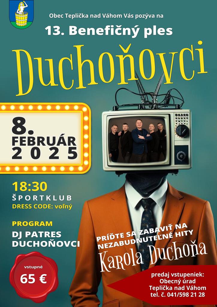Milí občania, pozývame Vás na 13. ročník Benefičného plesu, ktorý sa uskutoční 8. februára 2025 v priestoroch Športklubu v Tepličke nad Váhom. O program sa postará DJ Patres a Duchoňovci.