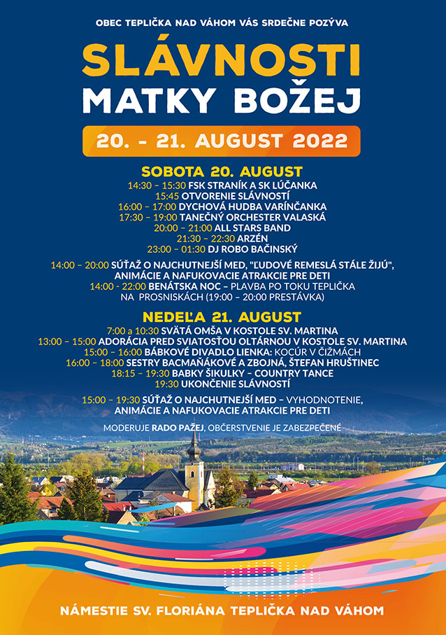 V dňoch 20. a 21. augusta 2022 Vás srdečne pozývame na Slávnosti Matky Božej, ktoré sa uskutočnia na Námestí sv. Floriána. Príďte sa zabaviť. Tešíme sa na Vás!