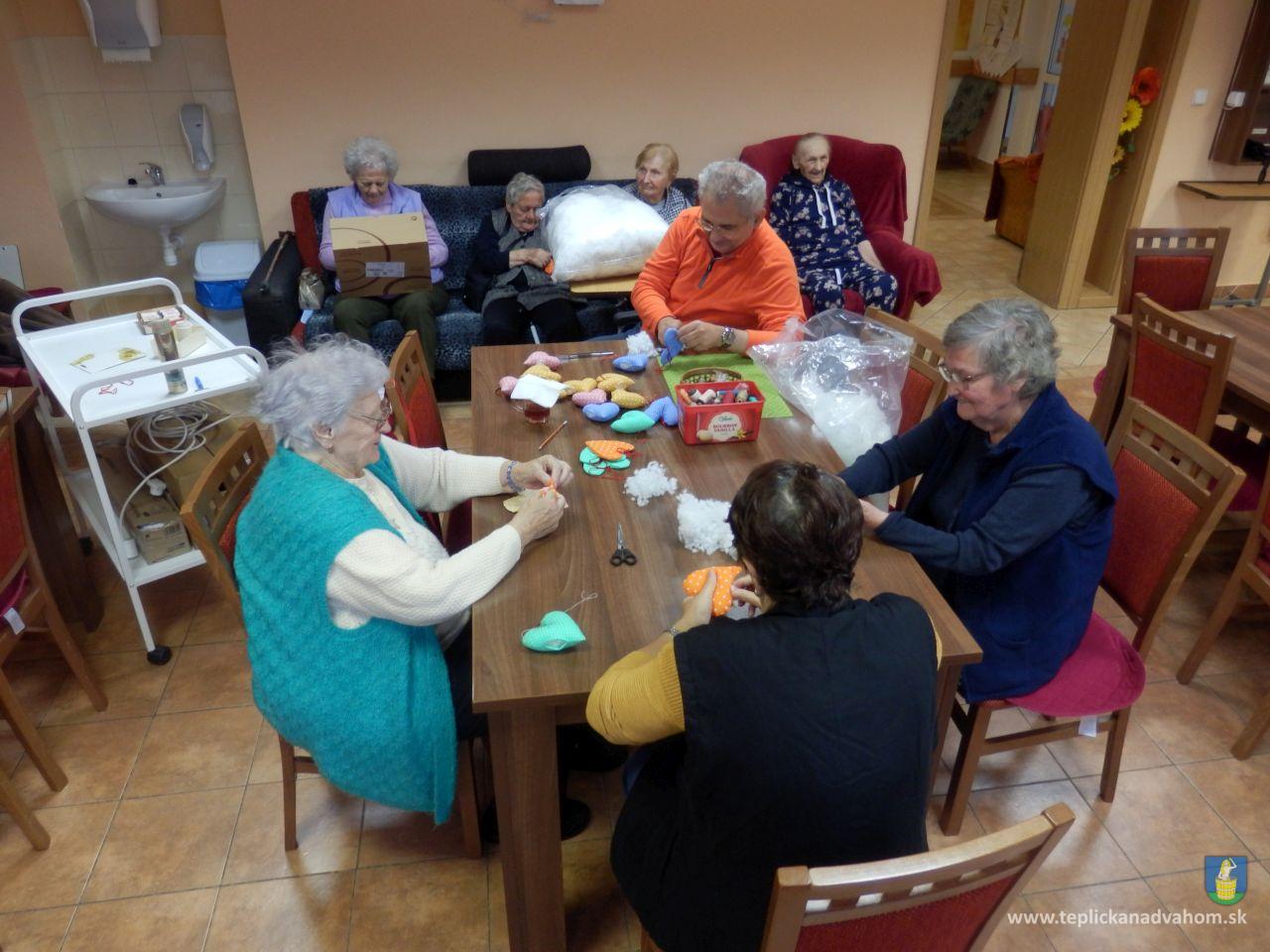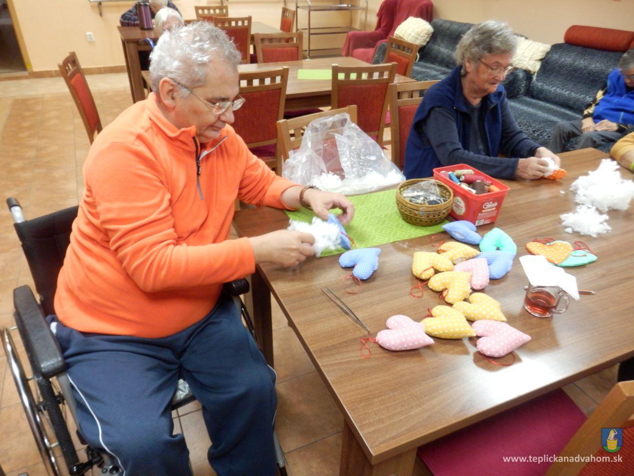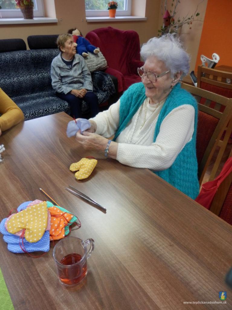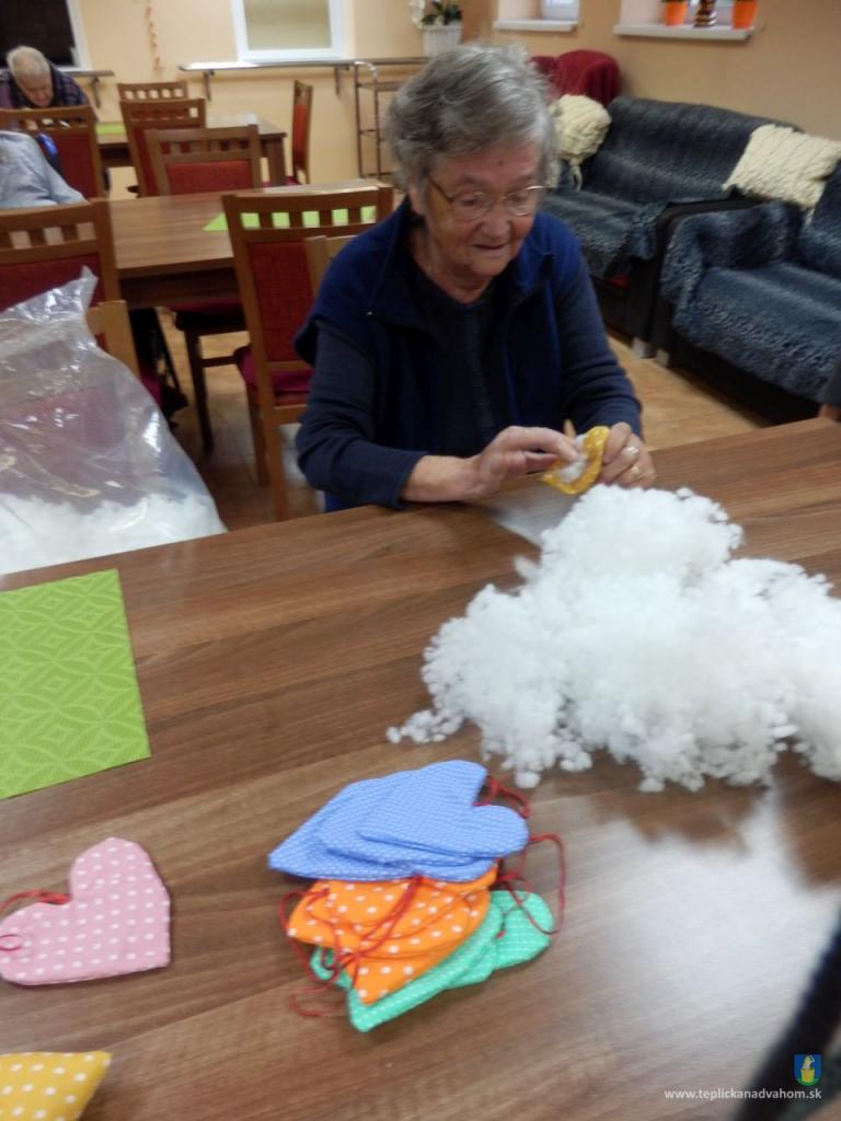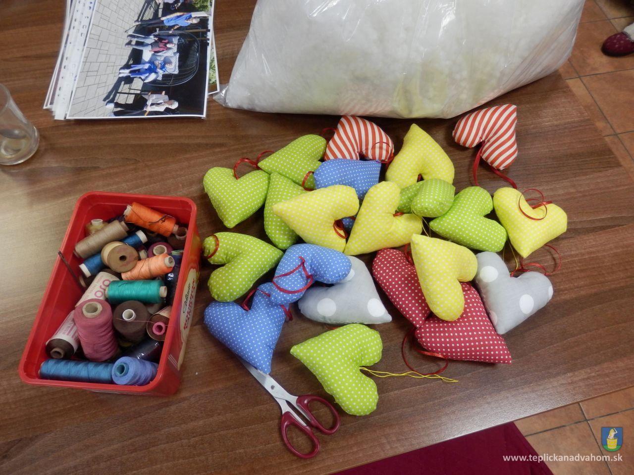 Vyrábame srdiečka pre detičky na uvítanie do života. Ergoterapeutka Zuzka nám predšije na stroji a potom ich naplníme a zašijeme. Do každého látkového srdiečka vkladáme aj kúsok svojho. Je to symbolika - Mladé sa snúbi so starým. A koľko radosti z toho klienti majú. Za dobrú prácu dostaneme aj sladkú odmenu. A je nám dobre. Pochmúrna nálada nie je naša kamarátka.