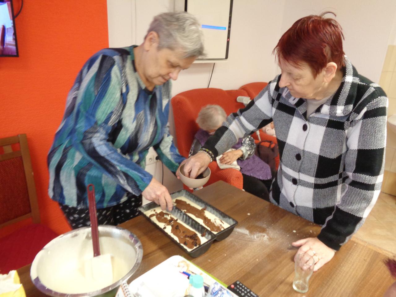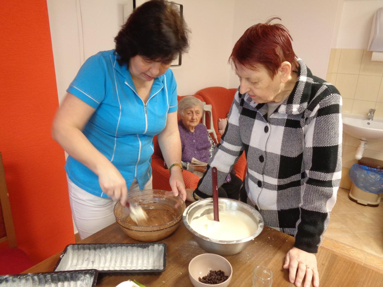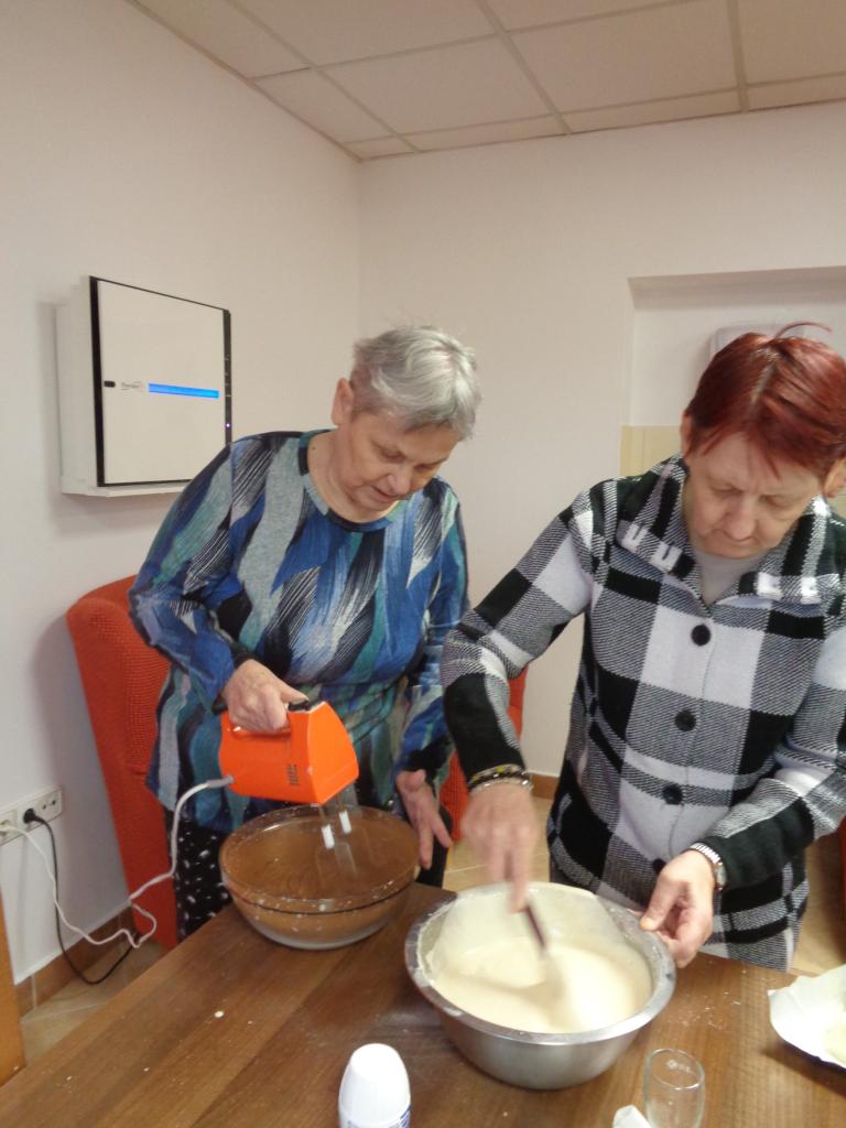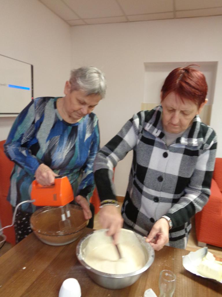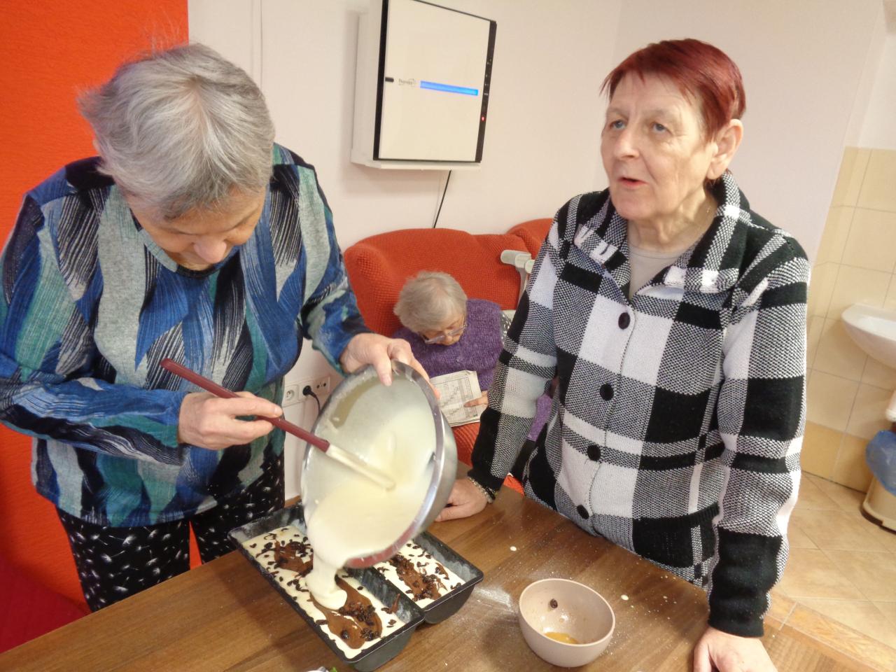 Jedna miešala, druhá vymastila formu. Práca im išla od od ruky. kým sa koláč piekol, zaspomínali sme si na obdobie, kedy ony piekli doma koláíče pre svojích blízkych. popoludní sme koláče ochutnali spolu pri kávičke.