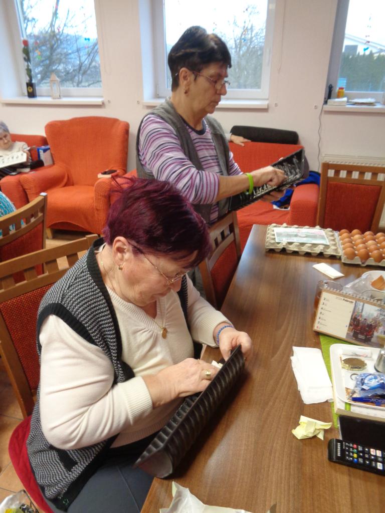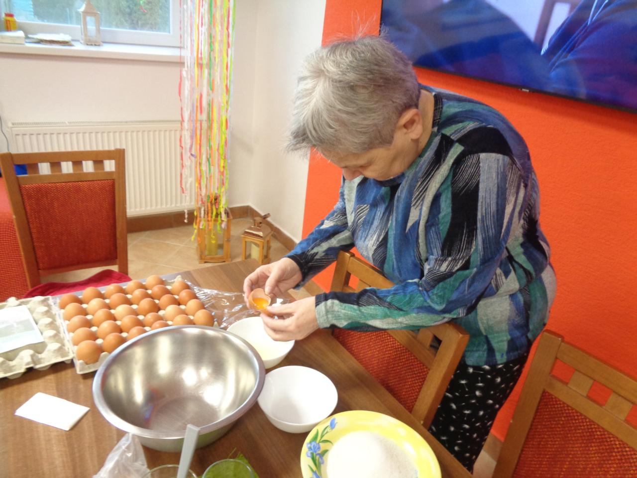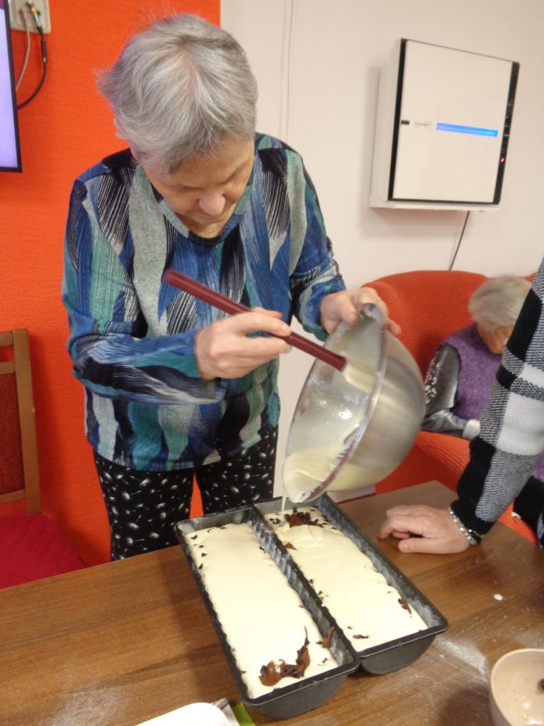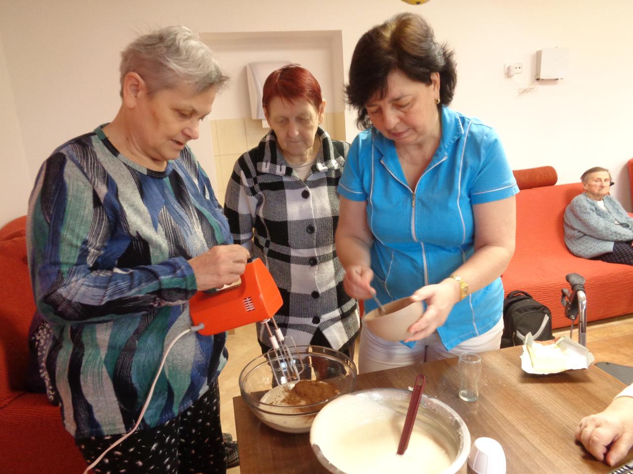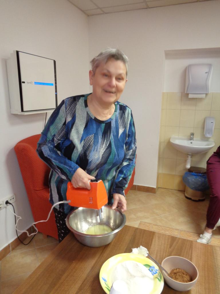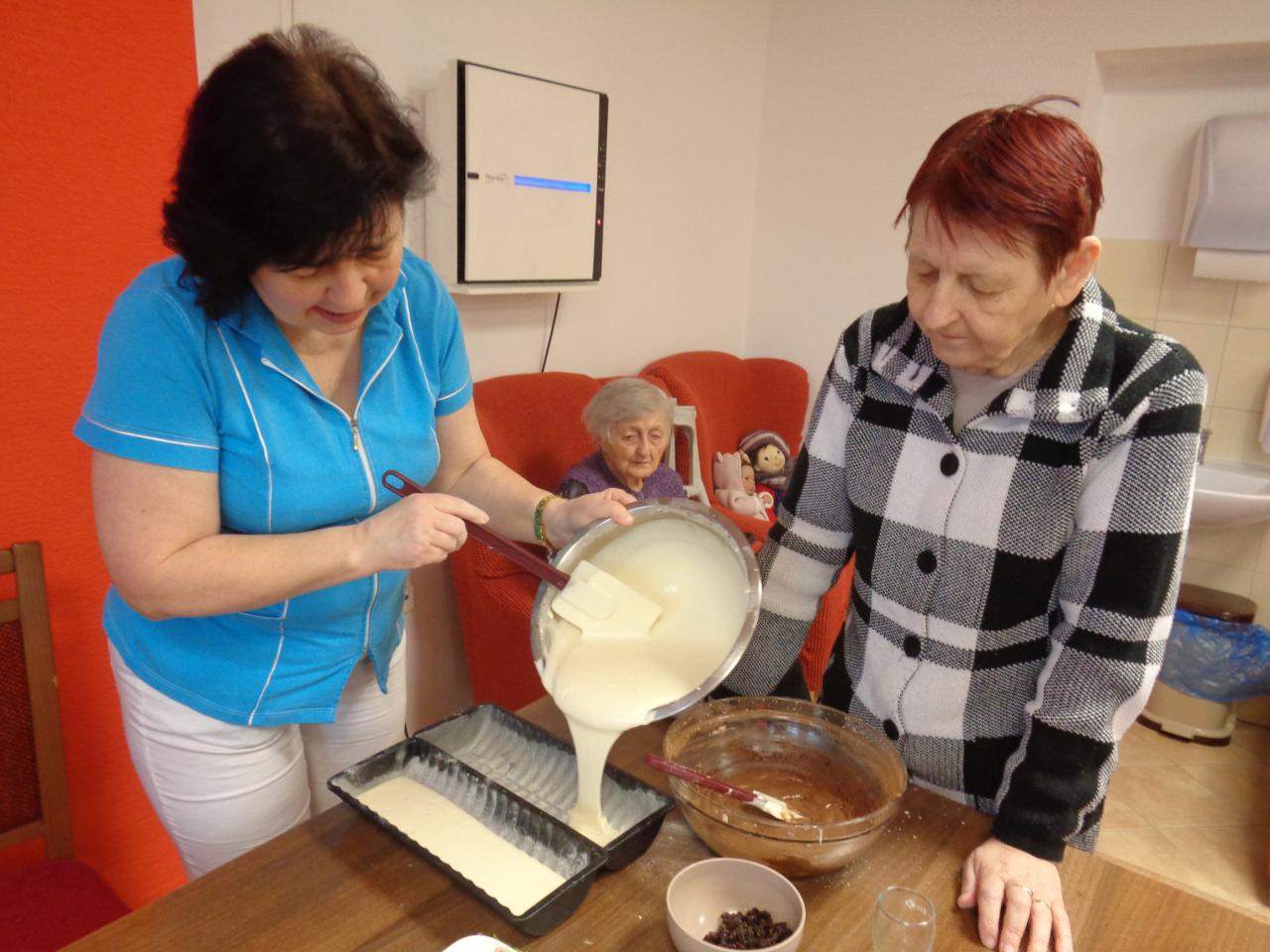Jedna miešala, druhá vymastila formu. Práca im išla od od ruky. kým sa koláč piekol, zaspomínali sme si na obdobie, kedy ony piekli doma koláíče pre svojích blízkych. popoludní sme koláče ochutnali spolu pri kávičke.
