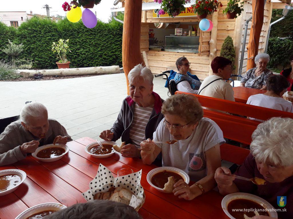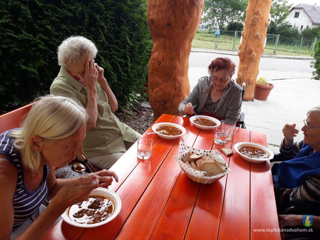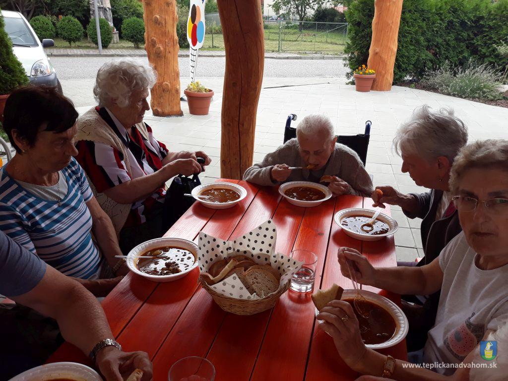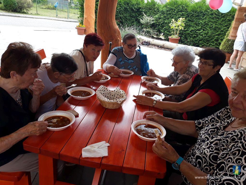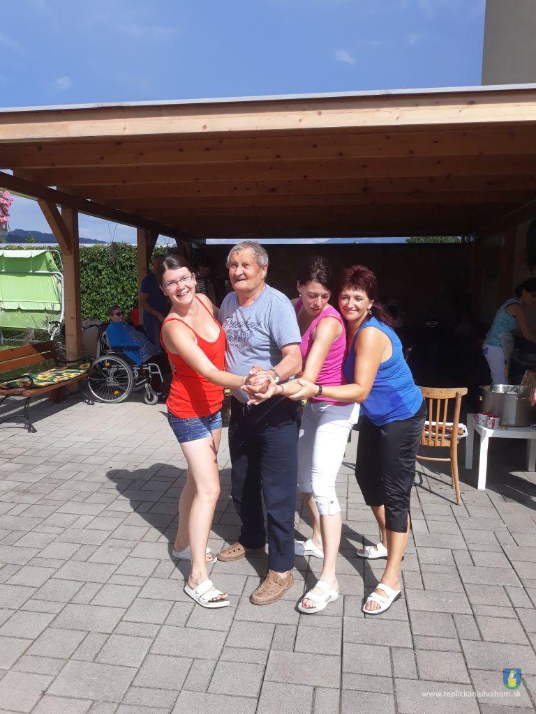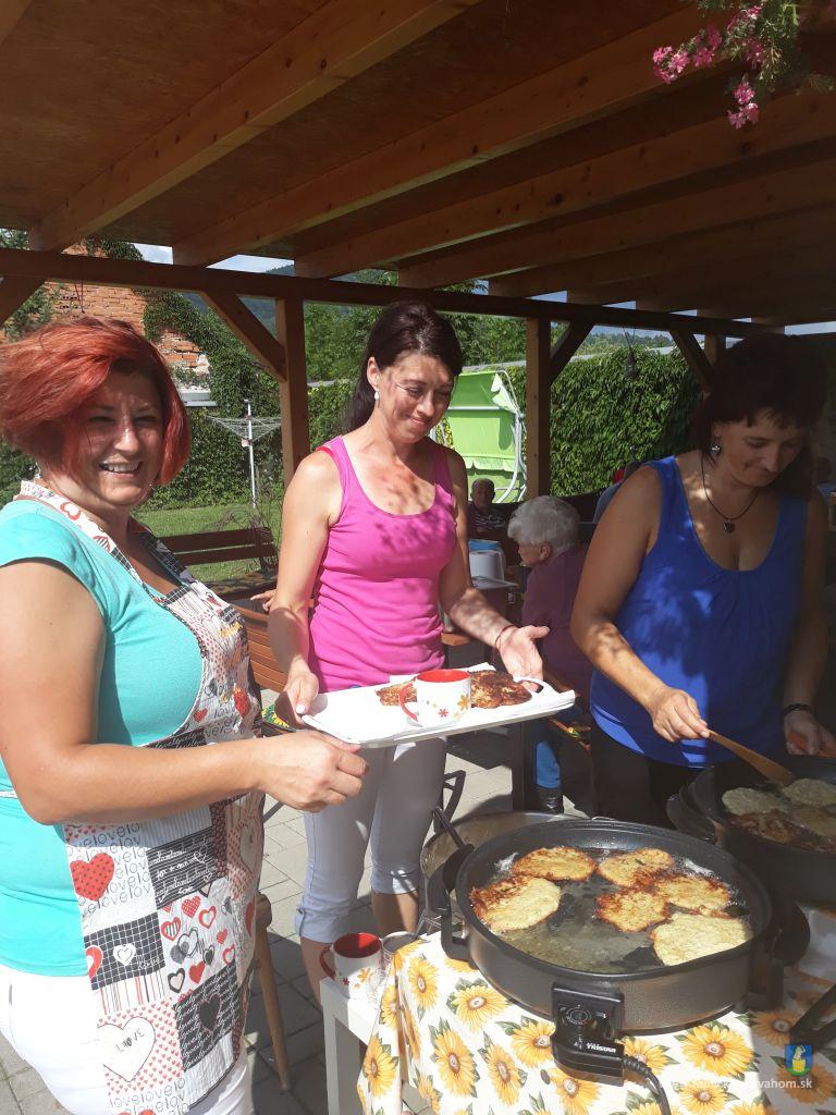 Dlhú cestu z nášho domova sme prešli pešo a tých, čo im nohy neslúžia, sme odviezli na vozíkoch. To bolo smiechu. Po príchode do areálu pri zmrzline sme sa posilnili kávou, osladili si život koláčikom a zábava pokračovala. Na obed nám Katka navarila guláš, o ktorom sa nám ešte pár dni snívalo. A ako bonus sme ešte dostali vytúžené pivo. Boli sme tak unavení, že cieľ bola posteľ v DPŽB, ale program bol iný. Vyfasovali sme škrobačky a úloha bola jasná. Oškrabať 15kg zemiakov, očistiť cibuľu, cesnak a začala sa podlisniková párty. Do práce nás prišli povzbudiť Tonko a Janko Zvarikovci s pomocníkmi harmonikou a ozembuchom. Myslíte, že vidina postele nás zlomila? Palice, chodítka išli do kúta a naše opotrebované nôžky sa roztancovali. A k tomu pekné piesne....