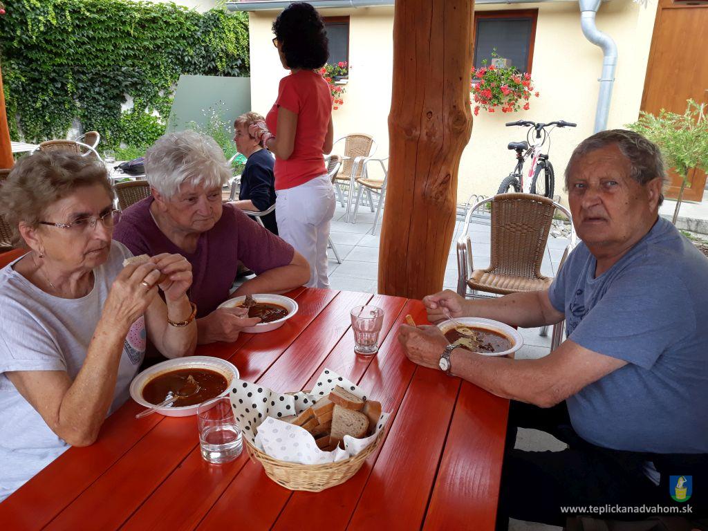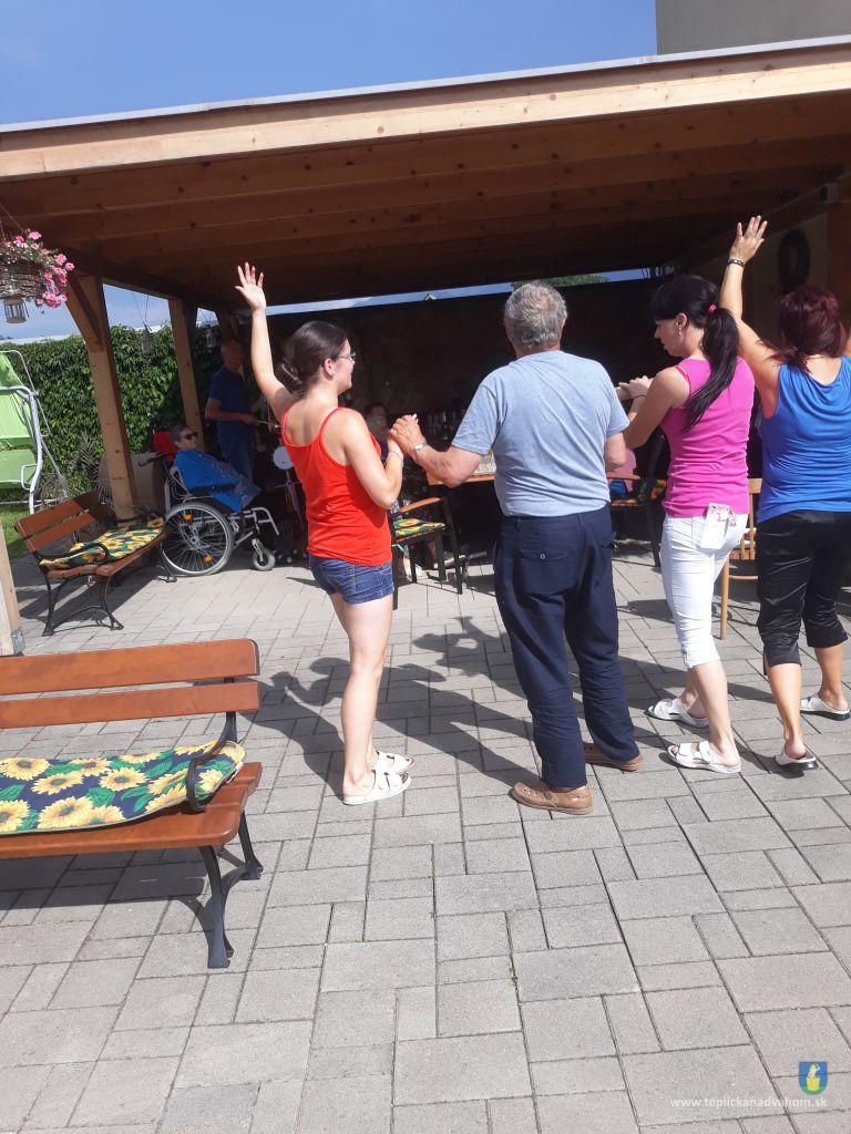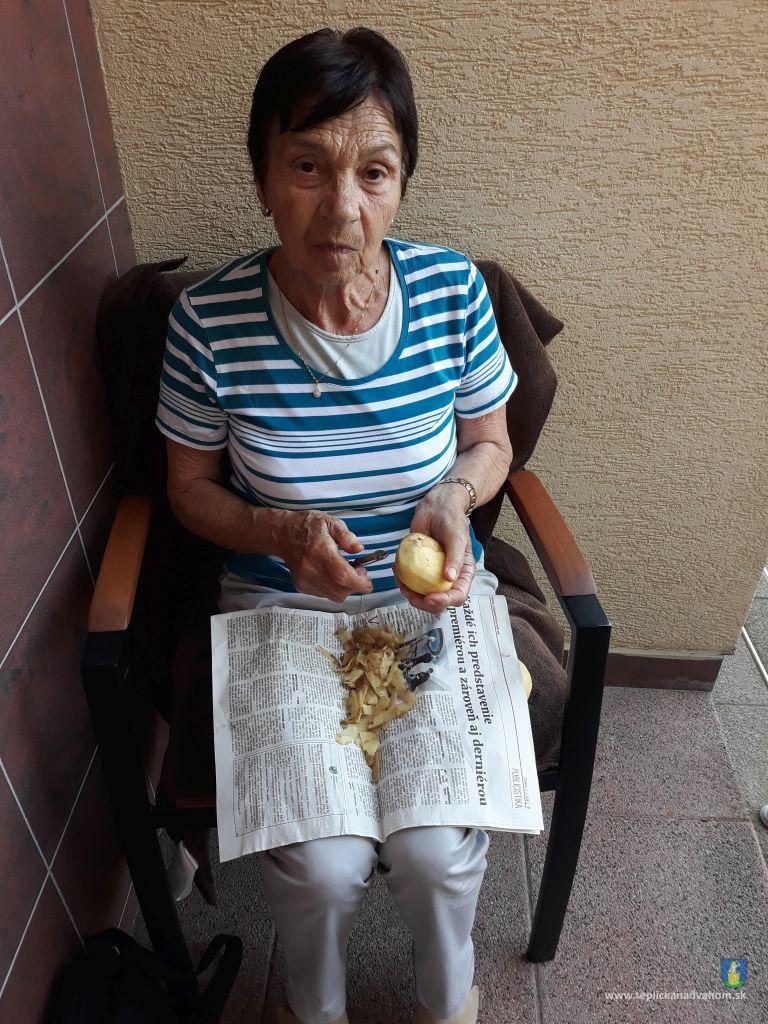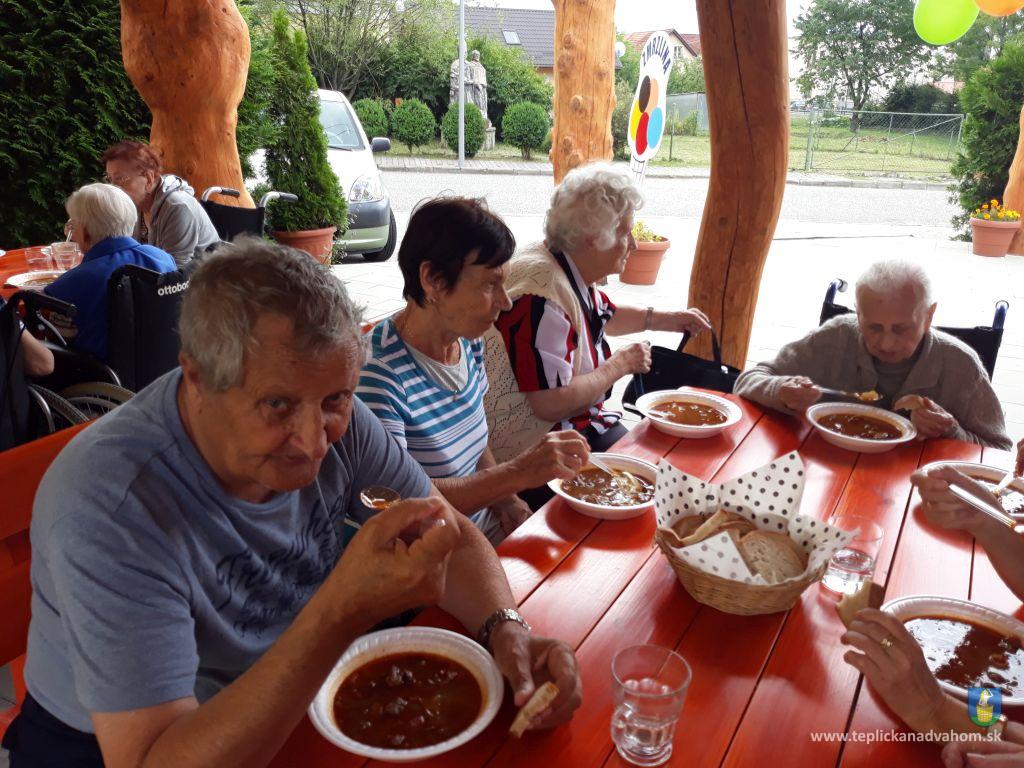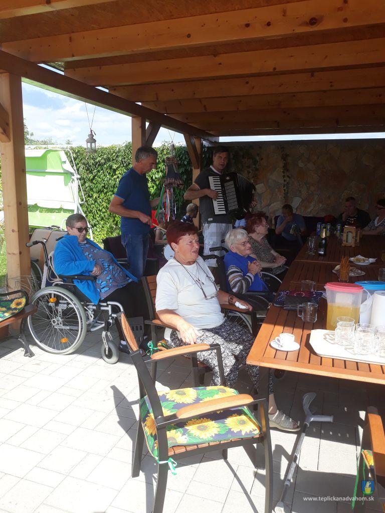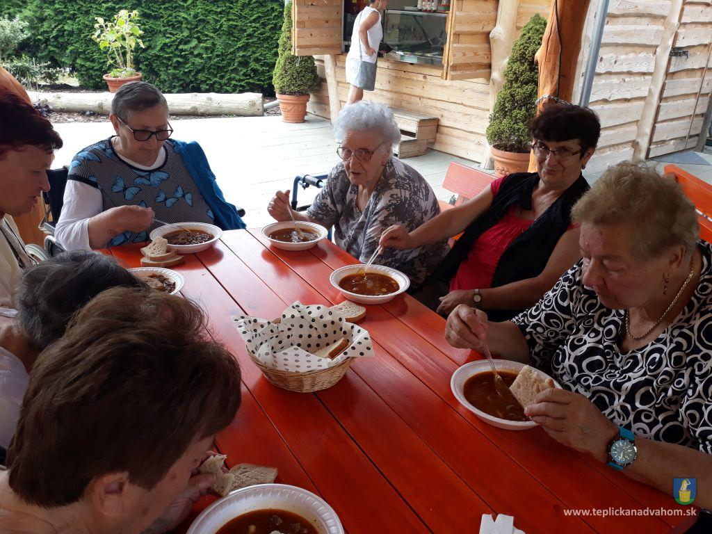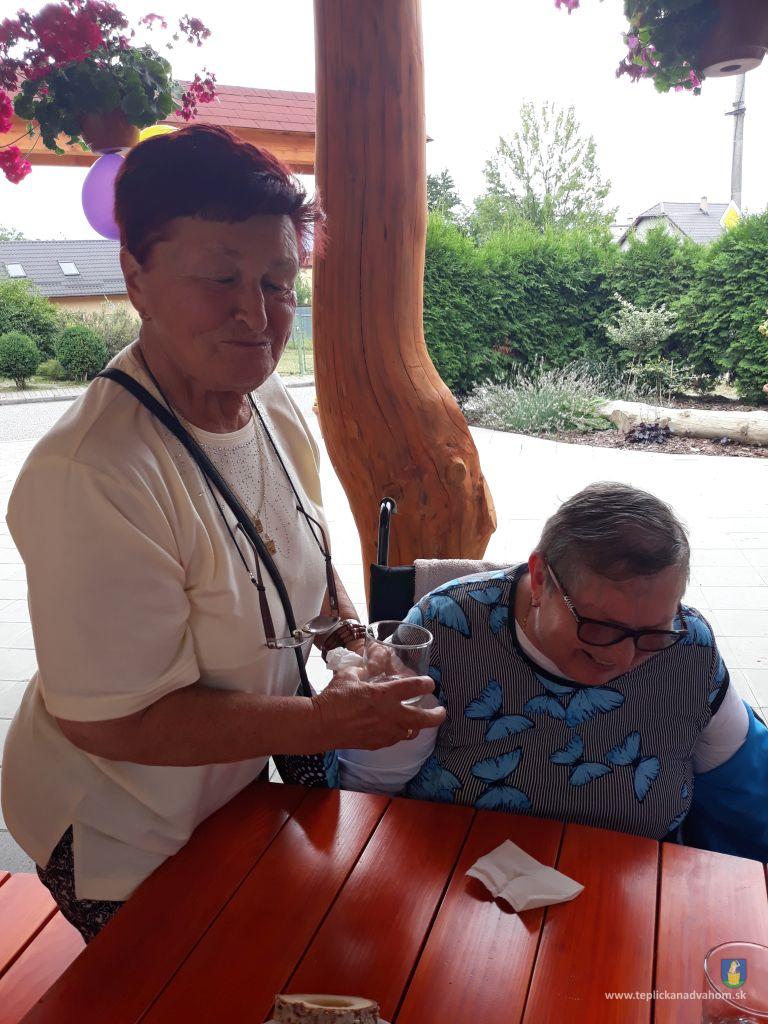 Dlhú cestu z nášho domova sme prešli pešo a tých, čo im nohy neslúžia, sme odviezli na vozíkoch. To bolo smiechu. Po príchode do areálu pri zmrzline sme sa posilnili kávou, osladili si život koláčikom a zábava pokračovala. Na obed nám Katka navarila guláš, o ktorom sa nám ešte pár dni snívalo. A ako bonus sme ešte dostali vytúžené pivo. Boli sme tak unavení, že cieľ bola posteľ v DPŽB, ale program bol iný. Vyfasovali sme škrobačky a úloha bola jasná. Oškrabať 15kg zemiakov, očistiť cibuľu, cesnak a začala sa podlisniková párty. Do práce nás prišli povzbudiť Tonko a Janko Zvarikovci s pomocníkmi harmonikou a ozembuchom. Myslíte, že vidina postele nás zlomila? Palice, chodítka išli do kúta a naše opotrebované nôžky sa roztancovali. A k tomu pekné piesne....