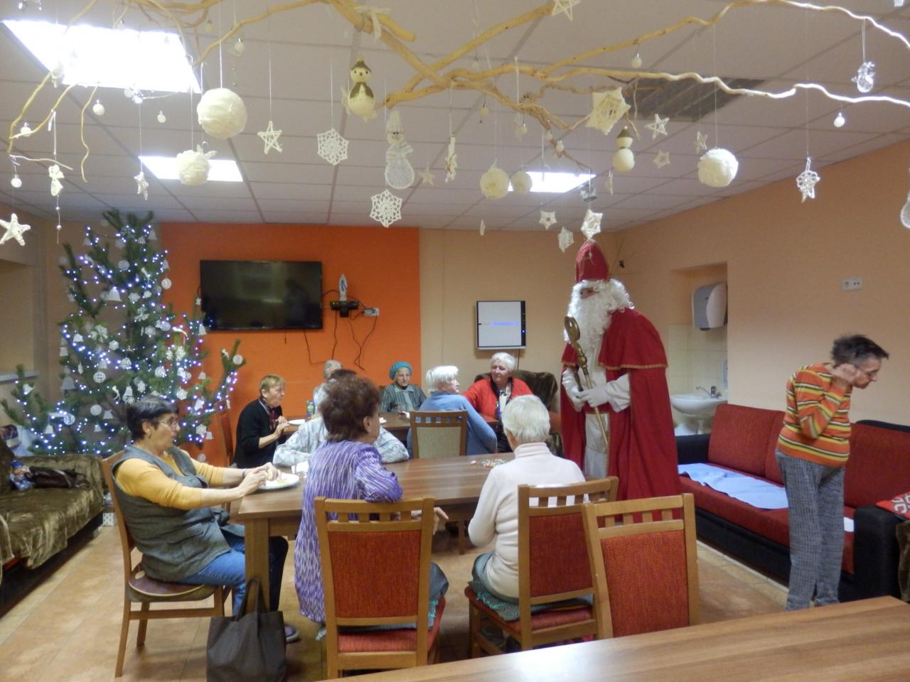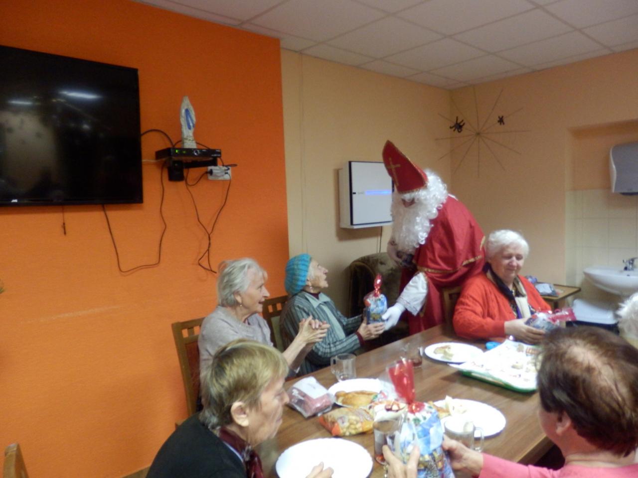 Po dobrom obede prišli medzi nás členky z Miestneho klubu zdravotne postihnutých s košom plným ovocia, veľkou krabicou so suchými koláčmi na Vianoce a nechýbali ani čokoládoví Mikuláši. To bolo radosti!