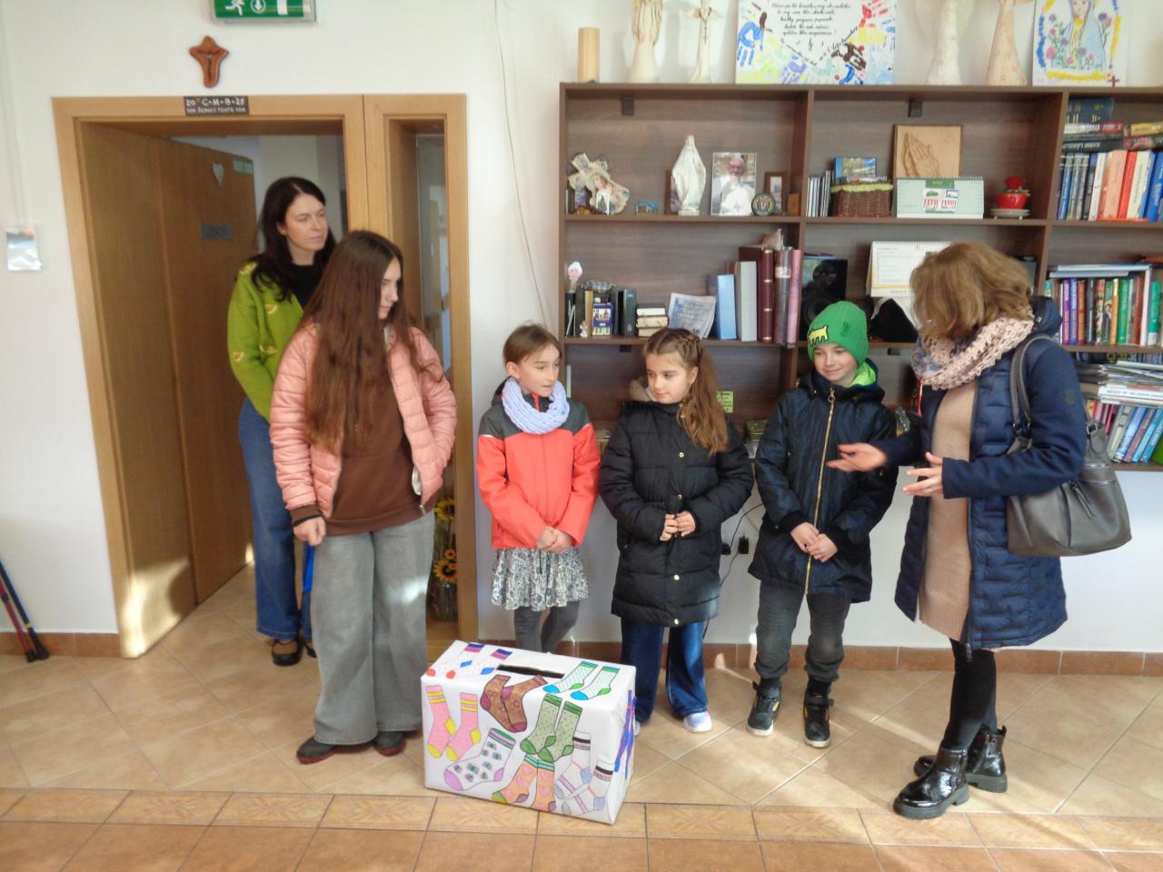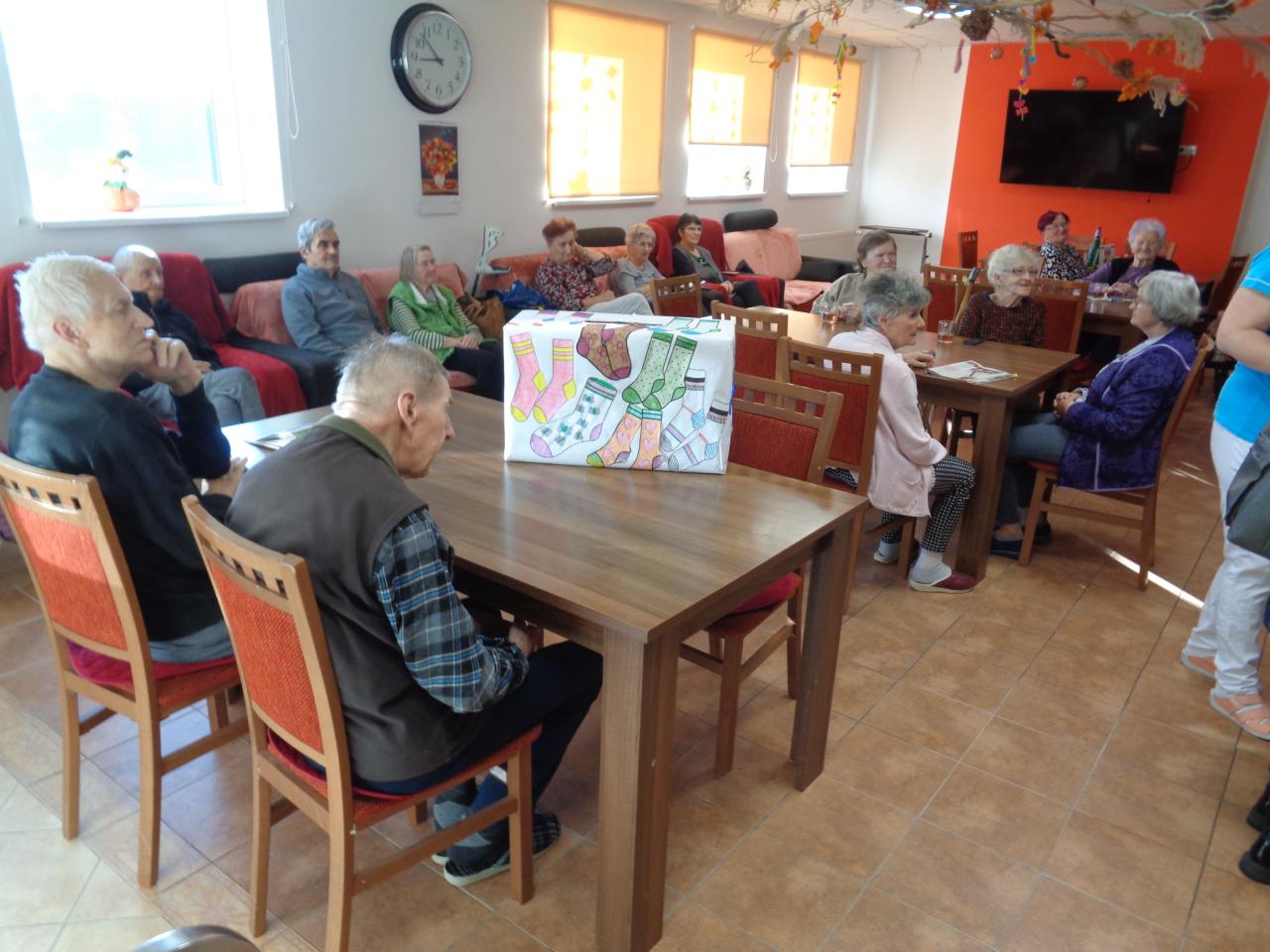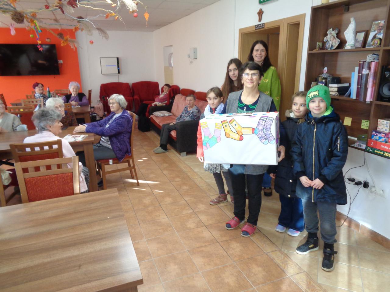 Ponožky pre starkých doniesli vo vlastnoručne vyrobenej a vyzdobenej krabici. Dnes nám tento darček prišli odovzdať, aby mali všetci naši starkí nôžky v teple. My sme deti za prácu odmenili tiež darčekom vlastnej výroby. Ďakujeme za milú akciu a tešíme sa na sľúbenú návštevu počas adventu.