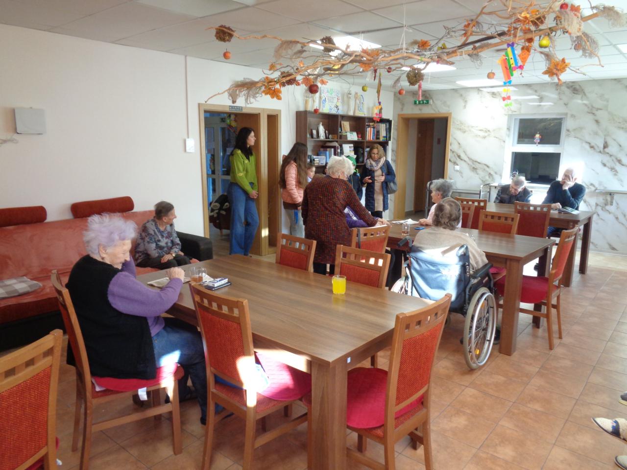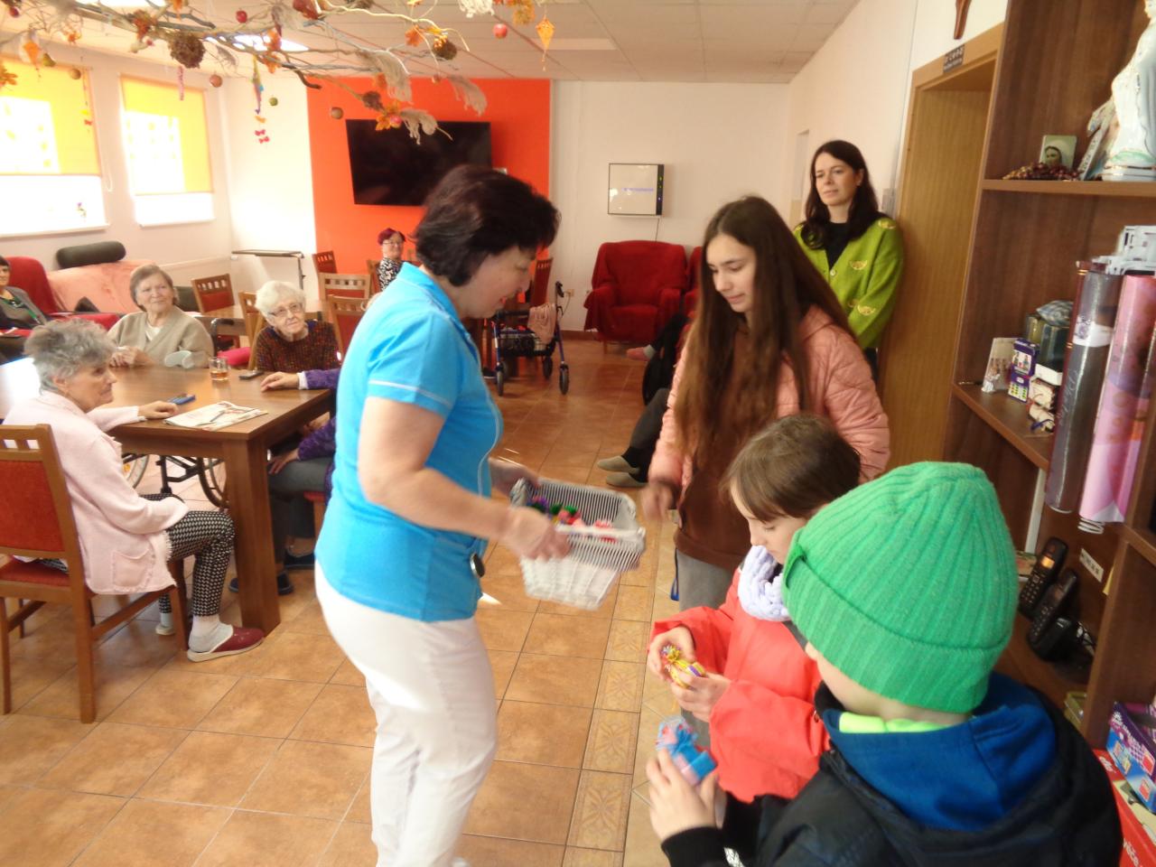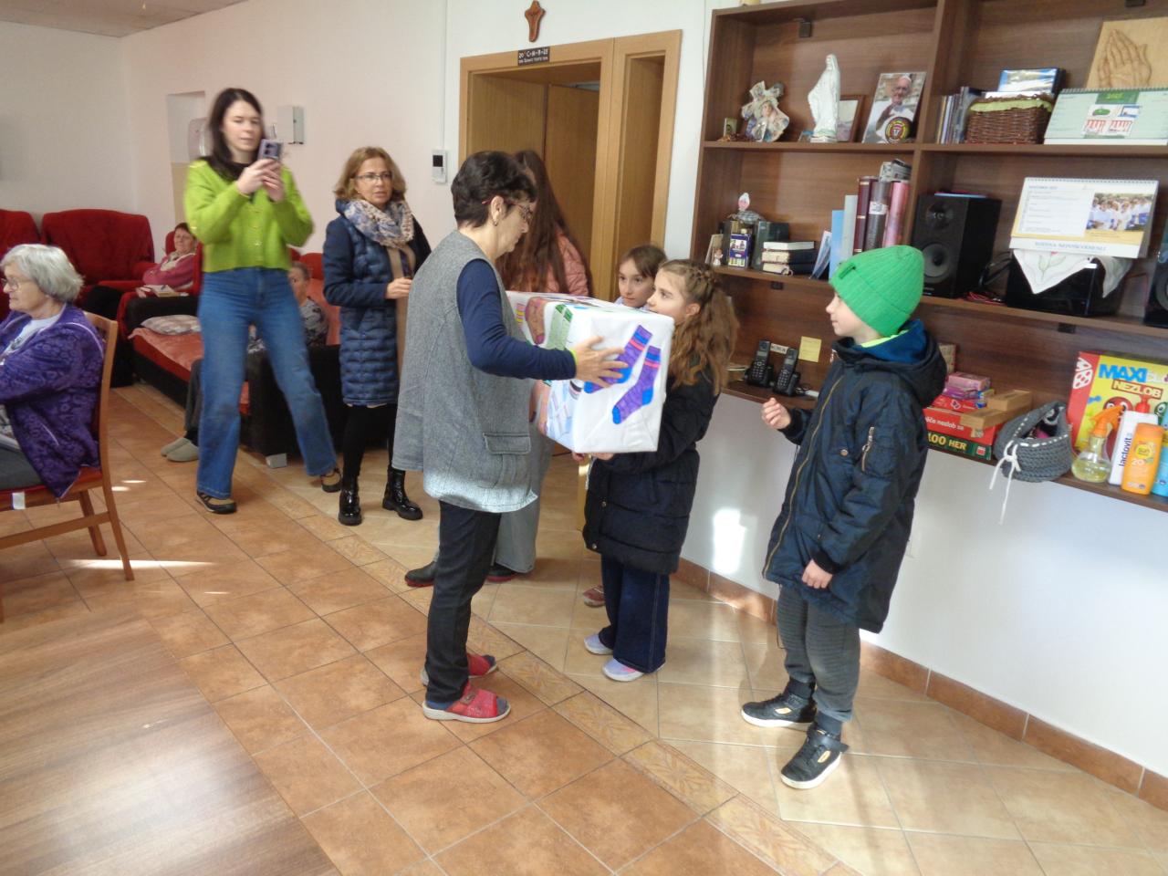 Ponožky pre starkých doniesli vo vlastnoručne vyrobenej a vyzdobenej krabici. Dnes nám tento darček prišli odovzdať, aby mali všetci naši starkí nôžky v teple. My sme deti za prácu odmenili tiež darčekom vlastnej výroby. Ďakujeme za milú akciu a tešíme sa na sľúbenú návštevu počas adventu.
