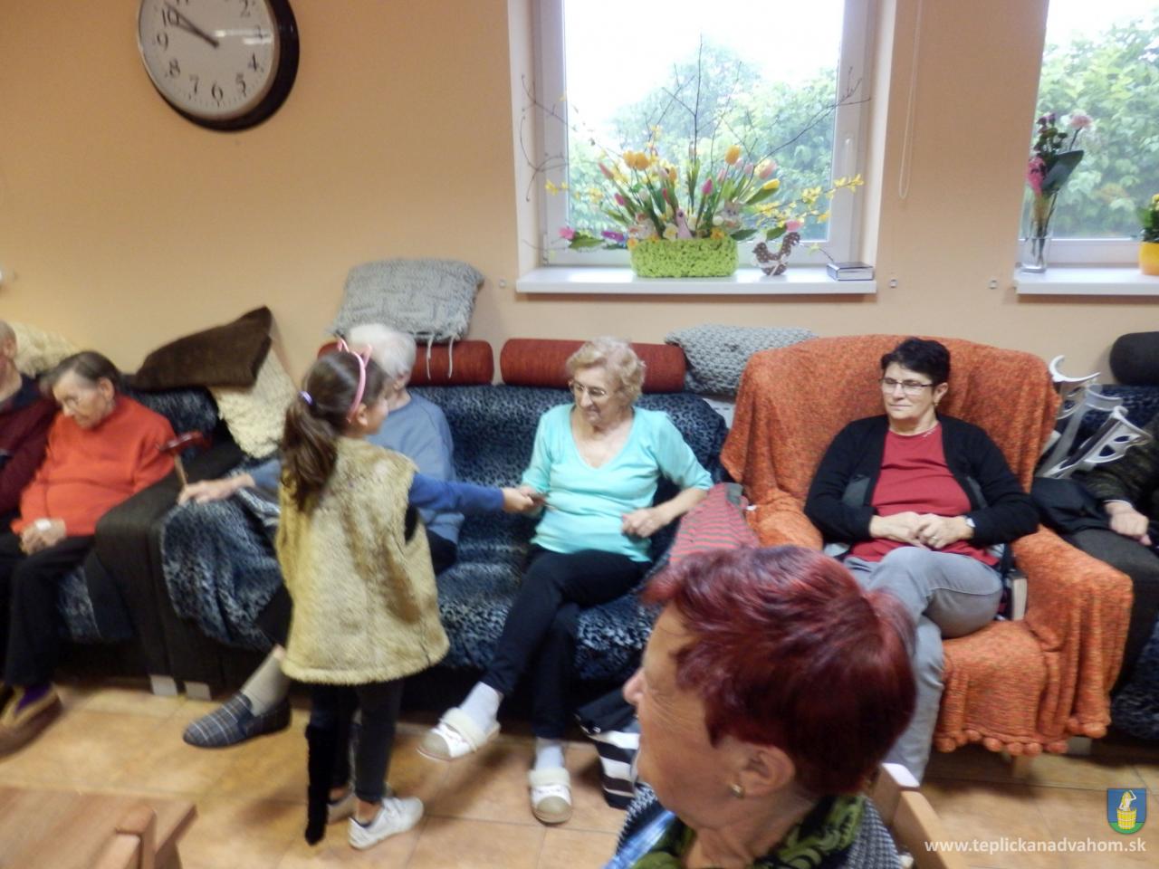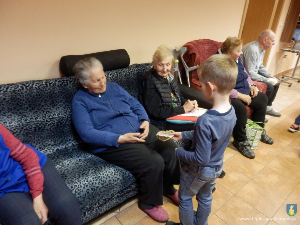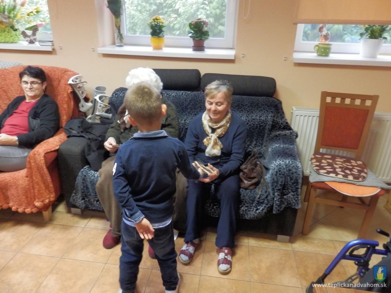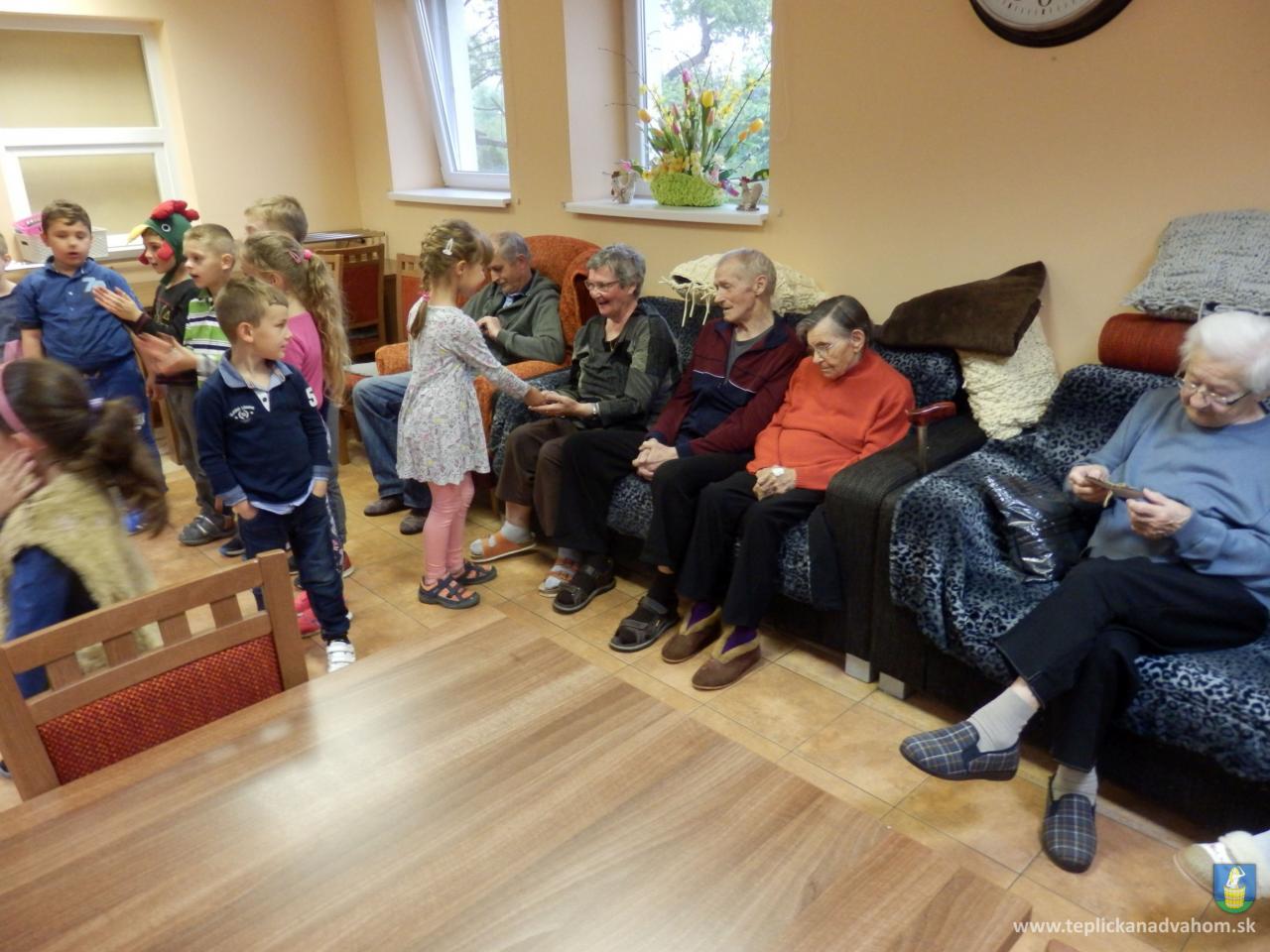 Ani prudký lejak neodradil deti z Materskej školy navštíviť nás pri príležitosti Dňa matiek. Pani učiteľky Labajová a Vajdová pripravili s 20timi predškolákmi pásmo pesničiek a básničiek. Deti nezabudli starkým priniesť malé darčeky, srdiečka vyrobené z lásky. Veselé, štebotavé detičky urobili zo sychravého upršaného dňa, deň plný radosti a smiechu. Ďakujeme.