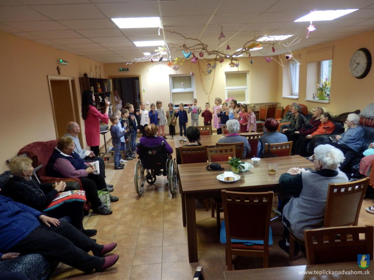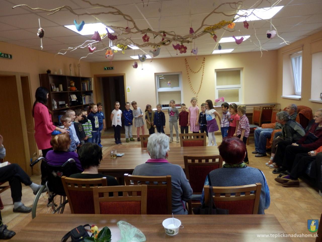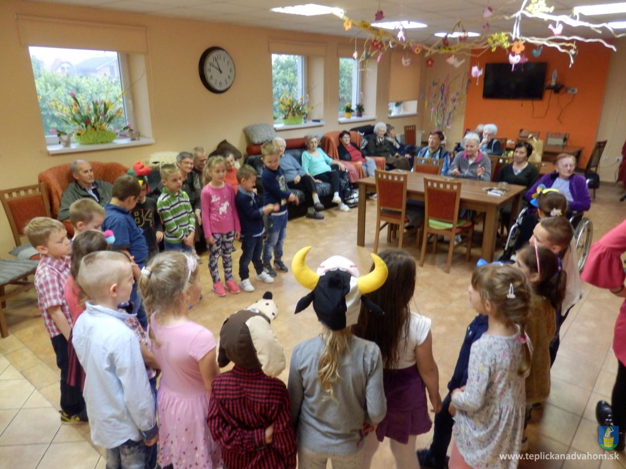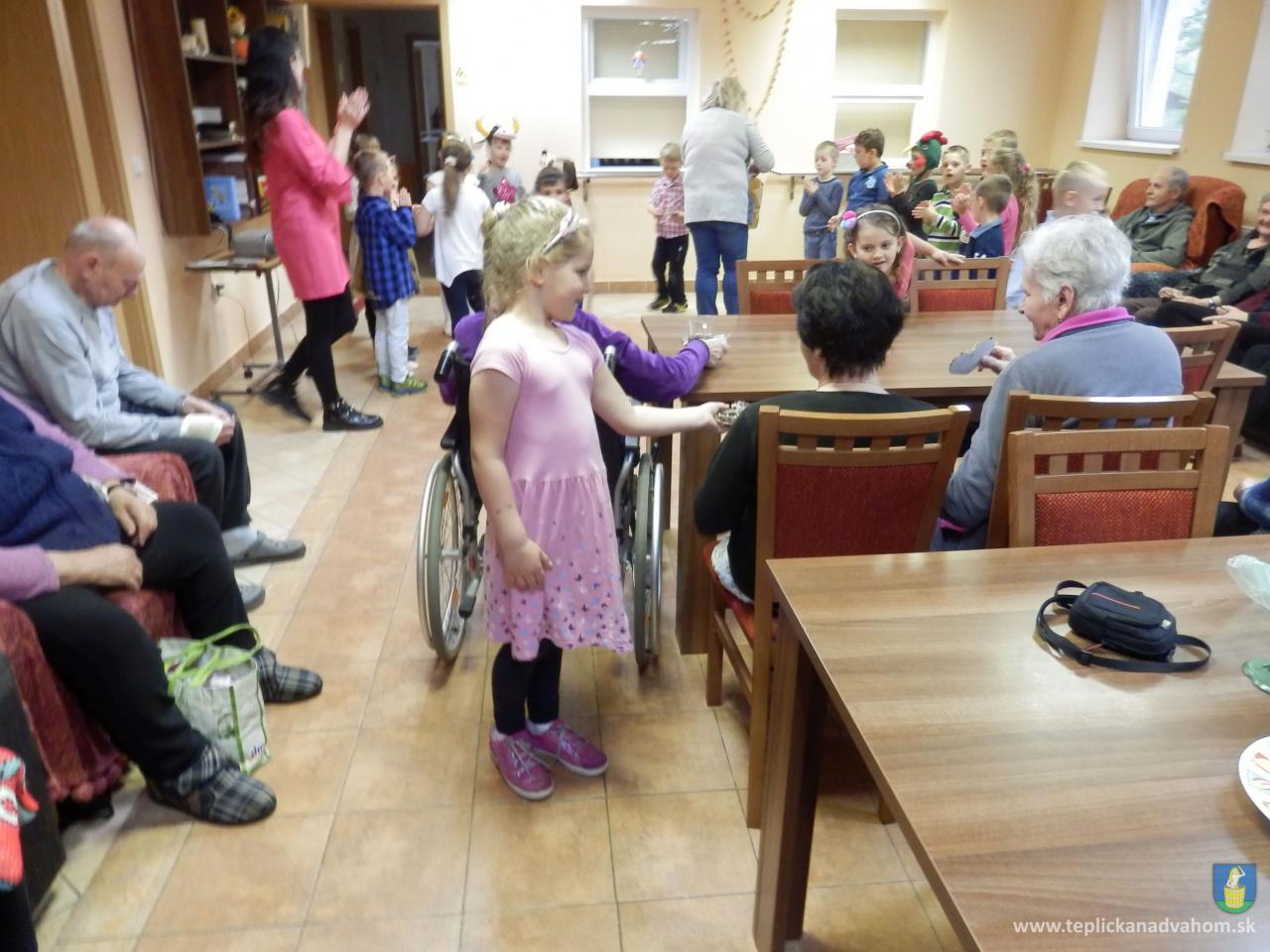 Ani prudký lejak neodradil deti z Materskej školy navštíviť nás pri príležitosti Dňa matiek. Pani učiteľky Labajová a Vajdová pripravili s 20timi predškolákmi pásmo pesničiek a básničiek. Deti nezabudli starkým priniesť malé darčeky, srdiečka vyrobené z lásky. Veselé, štebotavé detičky urobili zo sychravého upršaného dňa, deň plný radosti a smiechu. Ďakujeme.