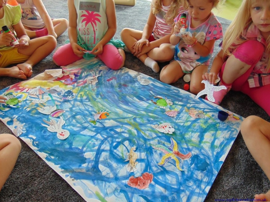 Počas celého týždňa sa detičky zoznamovali so svetom vody, dozvedeli sa veľa zaujímavých vecí o rybkách, kraboch, korytnačkách a iných vodných živočíchoch. Animátorky Danka, dve Barborky, Gabika, Hanka, Slávka, Monika, Zuzka a Julka pripravili pre deti bohatý program. Detičky si vyrábali vlastné jazierko, akvárium, maľovali more, učili sa chodiť ako krab, krokodíl alebo žralok. V rámci tvorivých dielní si vyrobili chobotnice, vymaľovali a povystrihovali medúzy, morské koníky a všelijaké iné vodné živočíchy. Počas športových aktivít sa zapájali do rôznych súťaží, behali, skákali, lozili, preliezali a hlavne sa všetci výborne bavili. V stredu obohatila program Slávka z Obecnej knižnice. Detičkám priniesla rôzne knihy, prečítali si spolu rozprávky, popozerali si encyklopédie.